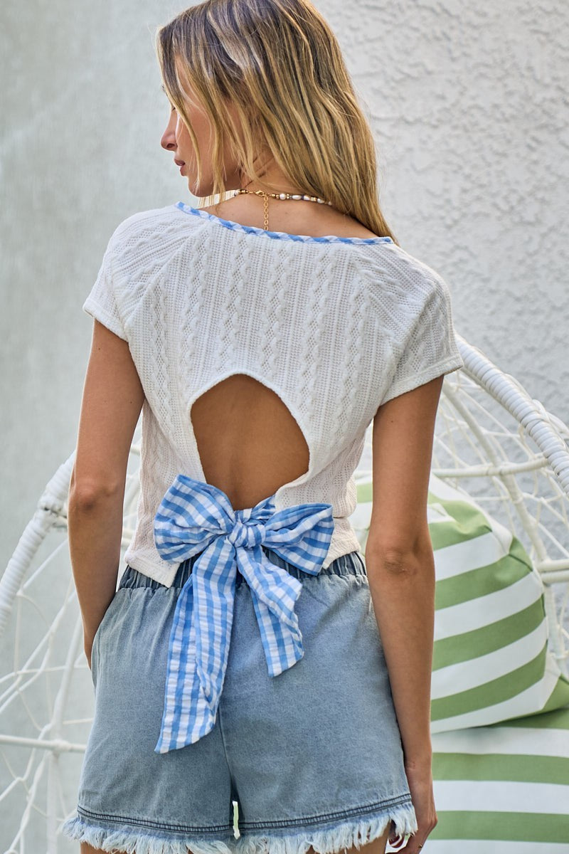 This cable knit top features a stylish back cut-out detail paired with a charming plaid ribbon tie, adding a unique and feminine touch to your wardrobe. Crafted for comfort and visual appeal, it effortlessly blends cozy texture with eye-catching design, making it perfect for both casual outings and special occasions. Elevate your look with this distinctive piece that combines classic knitwear with playful accents.